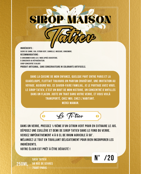 Le sirop Tatiev est une recette artisanal de cannelle, muscade, citron vert et gingembre, offrant une saveur naturelle et authentique. 100% sans colorant ni conservateur, il capture l’essence des ingrédients pour une expérience parfumée et pleine de caractère.